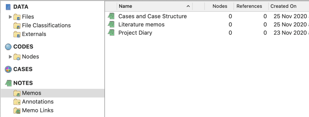 While I did try to keep my Project Diary in Nvivo using the memos feature, it works better for me in Scrivener where my Research Journal currently has a word count of 22,344 words (if only they were thesis words!). Keeping Literature memos in Nvivo makes sense though and I’ve made a start on that (not showing it in the screenshot though since these are my personal notes and reflections on selected literature this week).