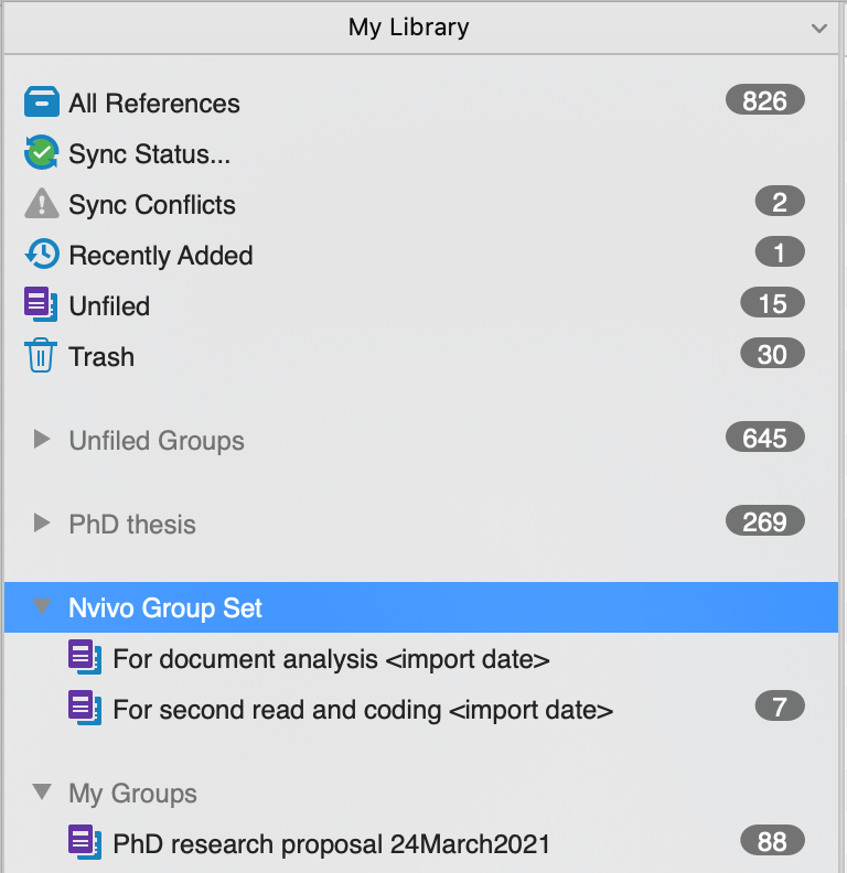 Taking the advice offered on board I plan to delete the articles I had already imported from EndNote and repeat the exercise selectively. Reading offline and taking initial notes makes sense to see if the article is something that will have value to my project. I have attached my highlighted PDF to the record in EndNote so that when imported across to Nvivo the highlighting will remain in place. In EndNote I have created an Nvivo Group Set and here is where I plan to create dated folders for every import into Nvivo. Another peer and I were wondering about this a while back since we didn’t want to end up with duplicate files in Nvivo so this approach should work.