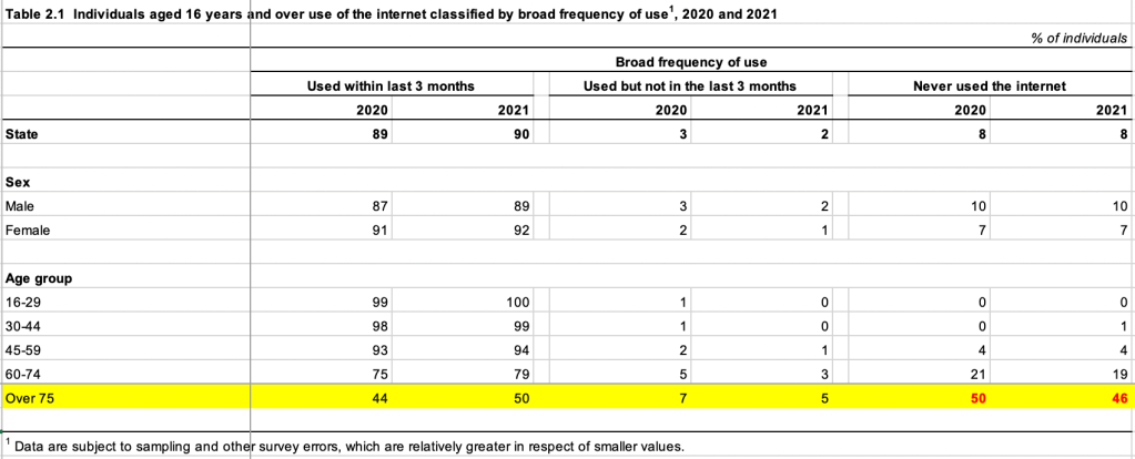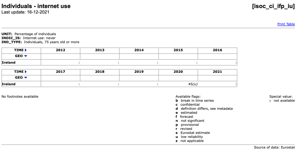 Okay, all interesting and important data but what about the 75+ age cohort? Time to try a different tactic – a Google search for ‘cso ireland data on internet use’ is more promising, landing on Information Society Statistics – Households 2019 > Frequency of Internet Usage – from here I could locate the 2021 data and yes, the 75+ age cohort appears: