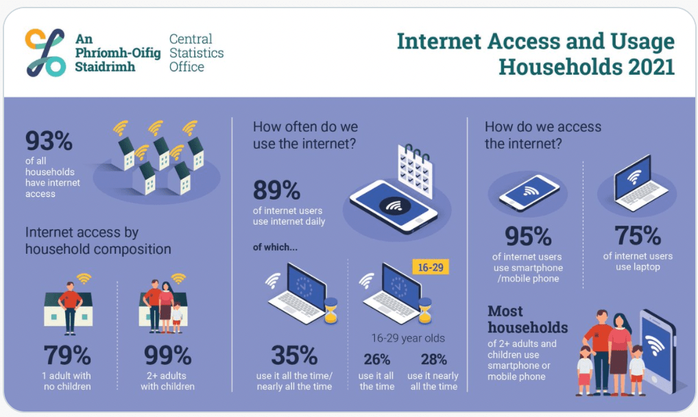 Frequency of Internet Usage – CSO – Central Statistics Office. CSO.ie. (2022). Retrieved 28 January 2022, from https://www.cso.ie/en/releasesandpublications/ep/p-isshict/internetcoverageandusageinireland2021/frequencyofinternetusage/.