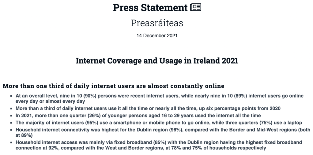 Undeterred I clicked through and landed on the press pages and the heading: “Internet Coverage and Usage in Ireland 2021.” This looked promising, at last data for Internet usage of the 75+ age group. Well, not exactly since the statistical release consisted of the tweet infographic above. Oh well, let’s see what the press statement had to say about this age cohort. Nothing in the bullet points: