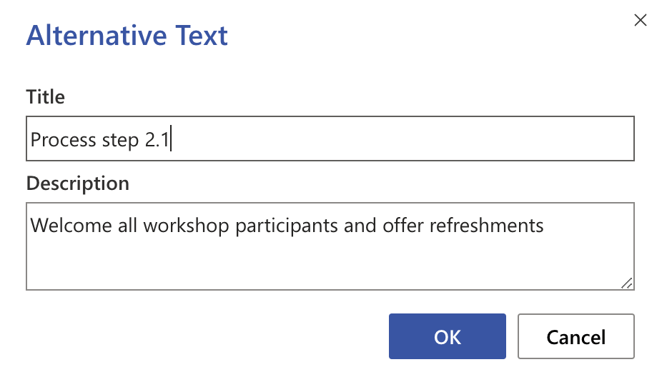 At that point I had not yet checked the document for digital accessibility but expected it to be in line with other Microsoft applications, and it was. While straightforward (path: select shape or connector > Shape > Alt-Text), it was somewhat painstaking adding Alt-text to not only shapes but also connectors and I kept my descriptions as simple as possible. For connectors and box numbers I added Title only. For boxes I copy/pasted the step information in Description.