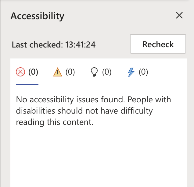 A rerun of the accessibility checker (path: Review > Check Accessibility) indicated that all was now in order.