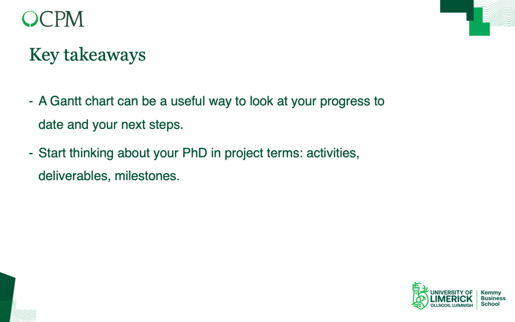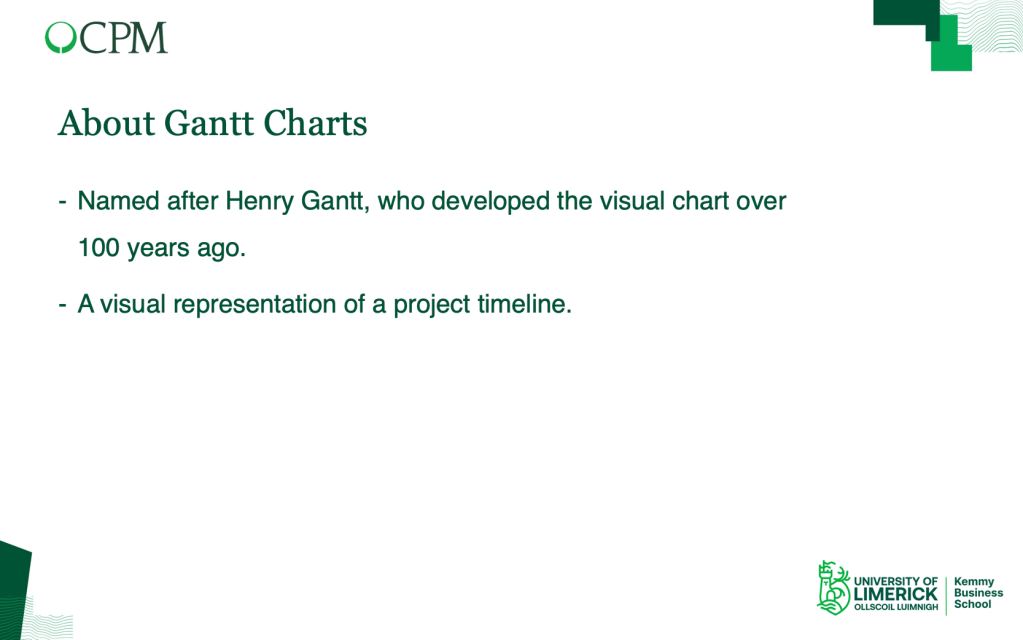 Gantt charts did not feature in my learning portfolio of blog posts on pathwaytophd. Why was this? Well, as a seasoned project manager I was very familiar with Gantt charts as a concept and with a variety of software tools to support their use. For my audience however, I could appreciate their perspective since they may never have come across a Gantt chart. Further, proactive students attempting to find out more by using Microsoft Copilot (our university-licenced Generative AI tool) may have been even more confused since the response to my prompt (how do I create a Gantt chart?) was not particularly helpful! So, I created a slide set to guide my talk and include my notes below for a wider audience to openly access if interested.
