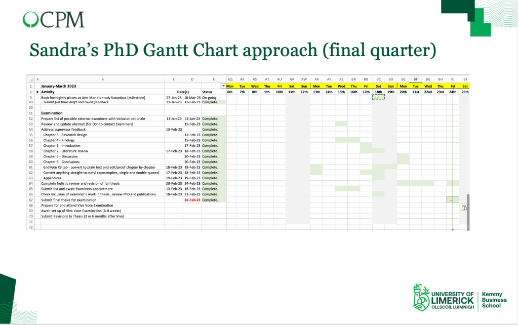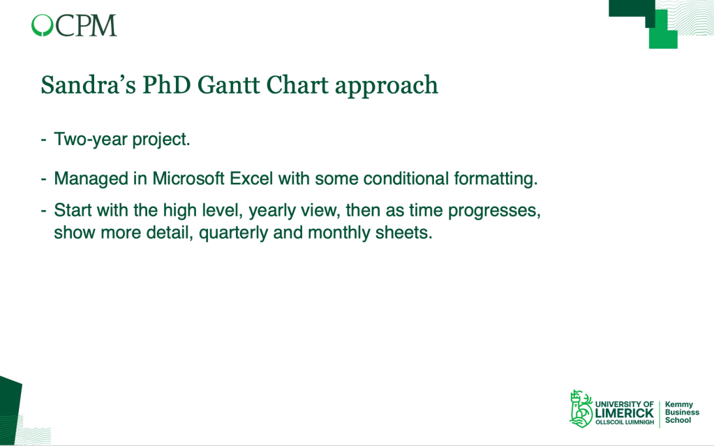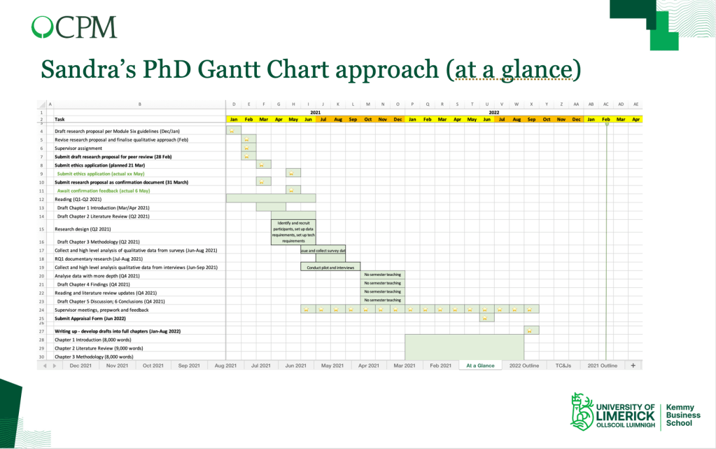 So, this has been a whistlestop tour of using a Gantt chart to manage your PhD research project. While many tools may be used, a simple Excel file with some basic conditional formatting should suffice and will minimise additional effort learning tools that may or may not do the same job!