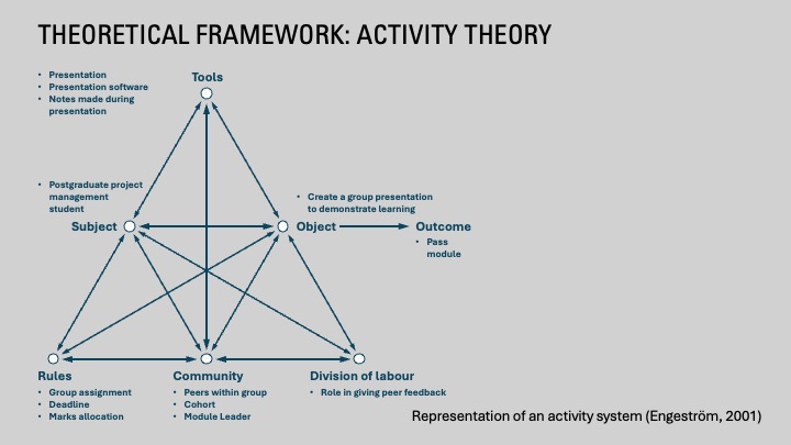 Coming from an industry background of project management and process improvement I like to reflect on my teaching practice and identify ways to improve the experiences of my students, whether on-campus or online. Having collected the qualitative data from my participants I wondered if there might be something a little different to my planned thematic analysis approach that would lend itself to the study. In April 2025, our small ‘Tuesday gang’ of PhD colleagues (all graduated by this time) was still meeting to catch up and chat about any research work we were pursuing. I asked Dave if he would look at my survey data to see if Activity Theory might be suitable and if so, would he like to collaborate? And so, our research project commenced in earnest.